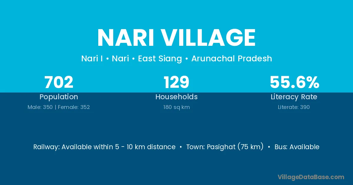 Pasighat (75 km) is the nearest town to Nari Village village for major economic activities and is located approximately 75 km away.