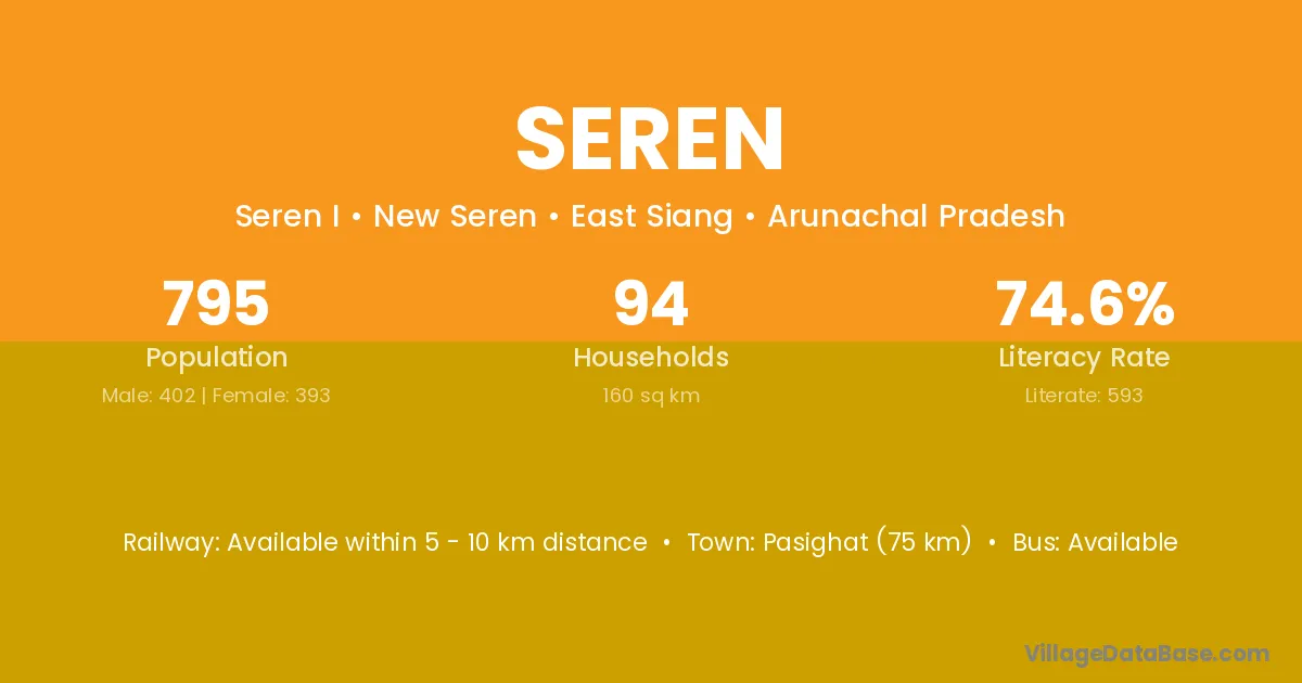 Pasighat (75 km) is the nearest town to Seren village for major economic activities and is located approximately 75 km away.