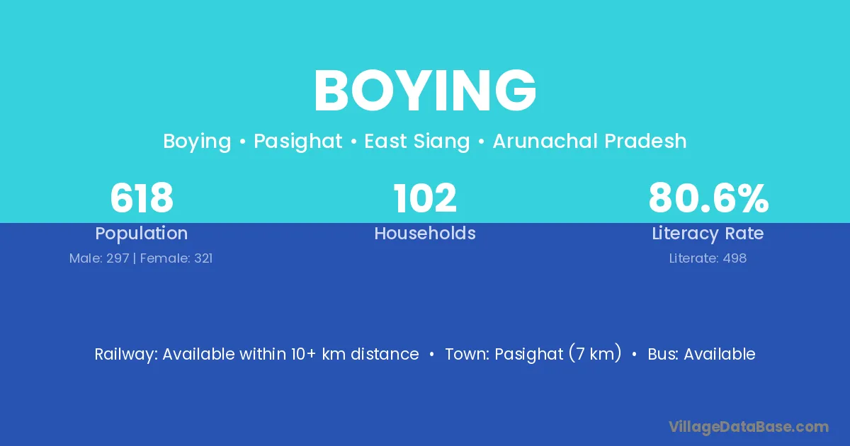 Pasighat (7 km) is the nearest town to Boying village for major economic activities and is located approximately 7 km away.