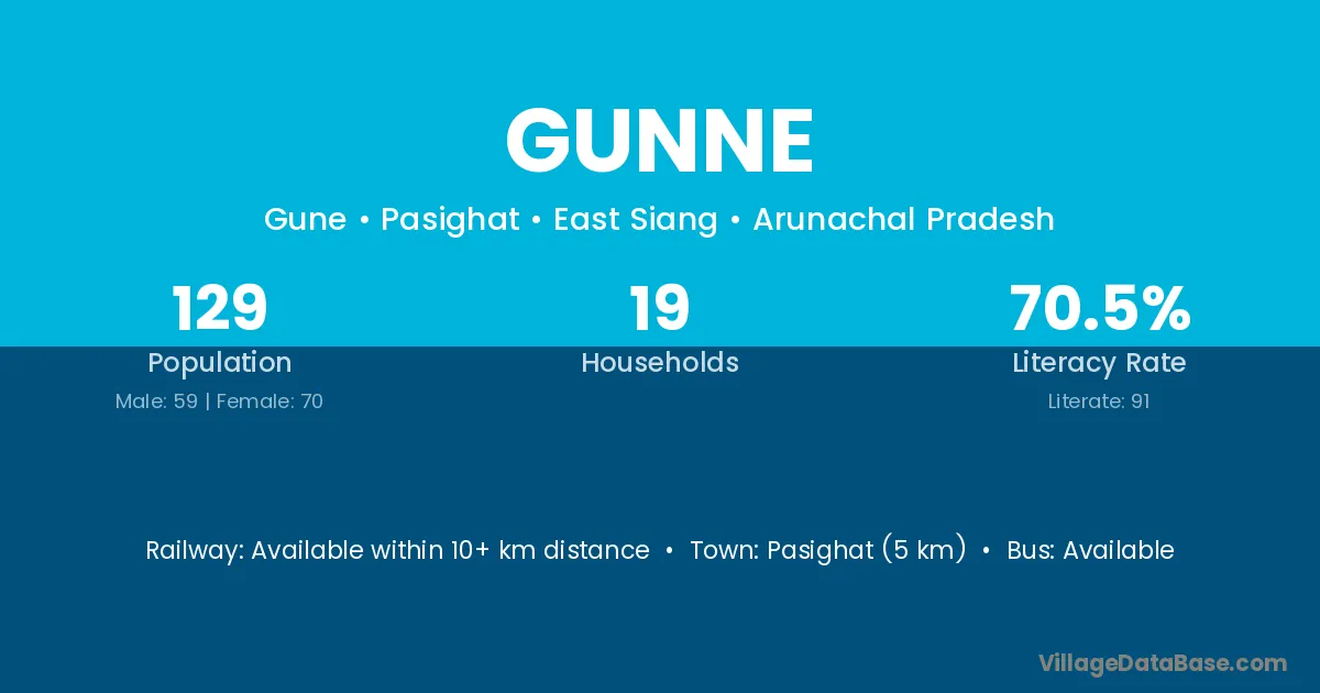 Pasighat (5 km) is the nearest town to Gunne village for major economic activities and is located approximately 5 km away.