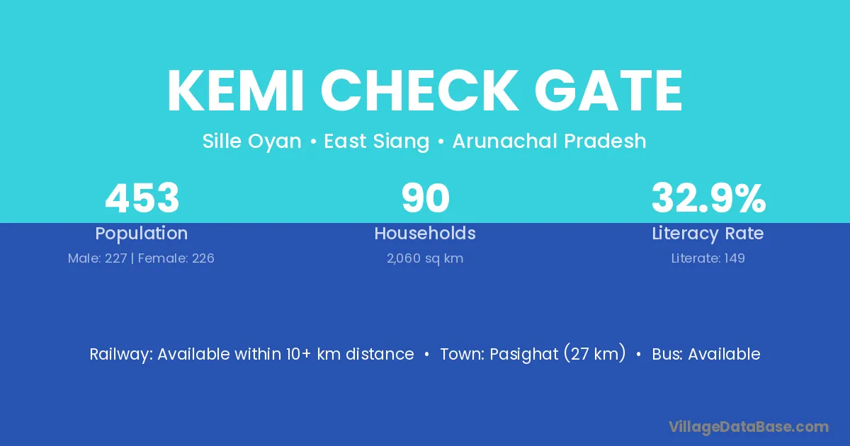 Pasighat (27 km) is the nearest town to Kemi Check Gate village for major economic activities and is located approximately 27 km away.