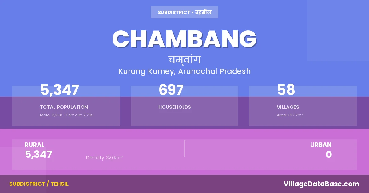 Chambang is a town and Circle in the Kurung Kumey district of the Arunachal Pradesh. In India, a Circle is a subdivision of a district responsible for the administration and revenue collection of a specific area within the district. Circles play a crucial role in the local governance structure, contributing significantly to the development and administration of their communities.