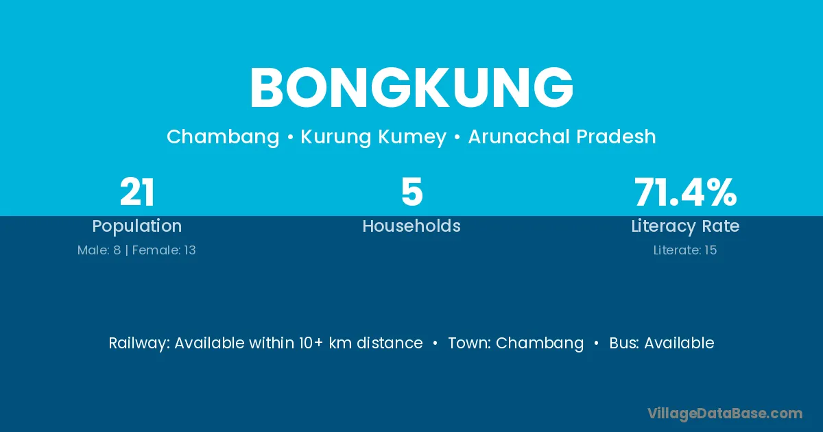 Bongkung village has a total population of 21 people, of which 8 are males and 13 are females.