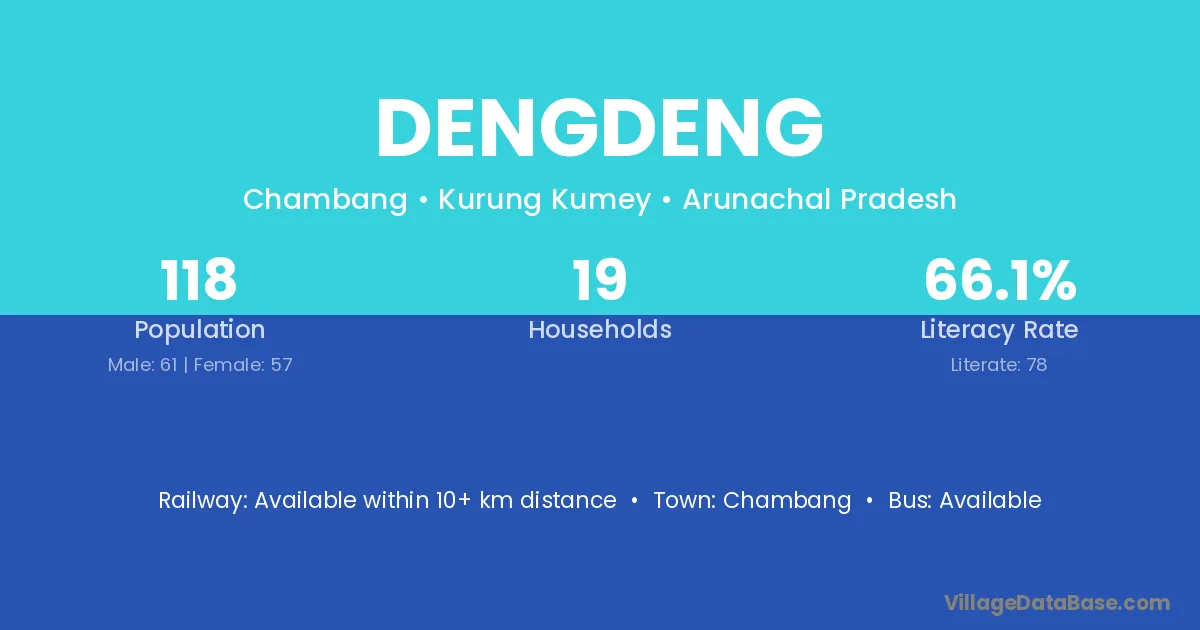 Dengdeng village has a total population of 118 people, of which 61 are males and 57 are females.