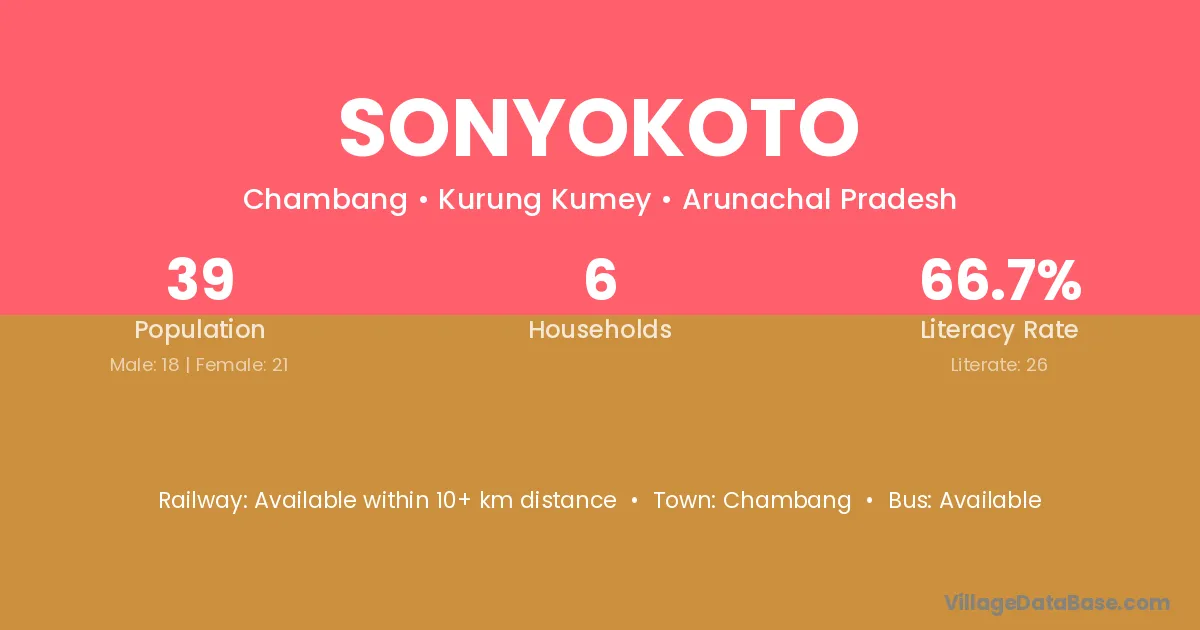 Sonyokoto village has a total population of 39 people, of which 18 are males and 21 are females.