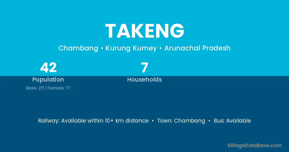 Takeng village has a total population of 42 people, of which 25 are males and 17 are females.
