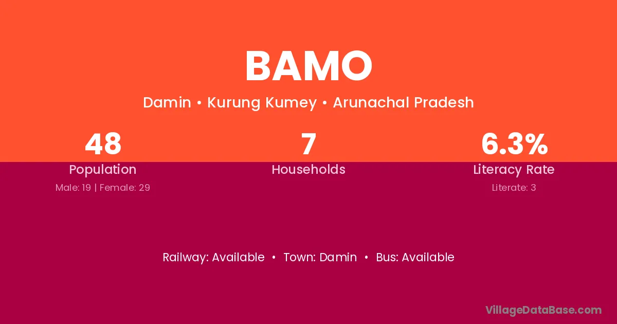 The literacy rate of Bamo village is 6.25%. Male literacy stands at 10.53% and female literacy at 3.45%.