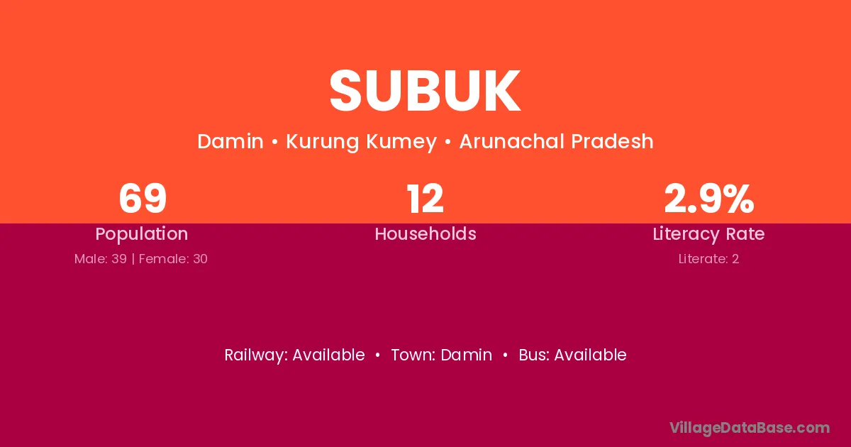 Subuk village has a total population of 69 people, of which 39 are males and 30 are females.