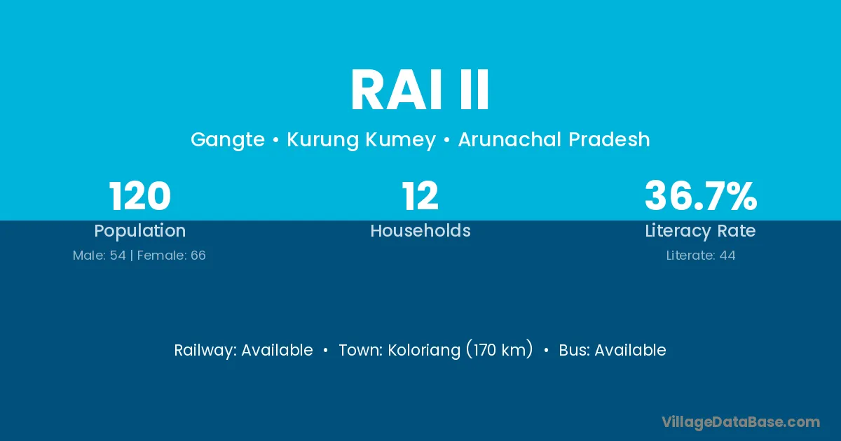 The literacy rate of Rai Ii village is 36.67%. Male literacy stands at 37.04% and female literacy at 36.36%.