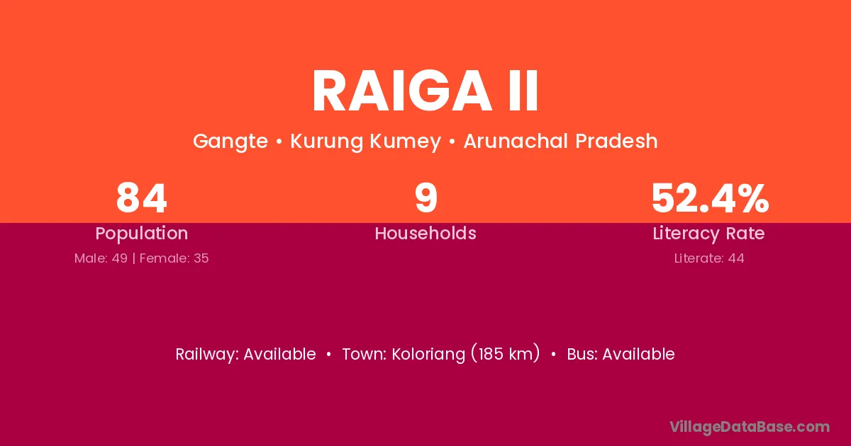 Koloriang (185 km) is the nearest town to Raiga Ii village for major economic activities and is located approximately 185 km away.