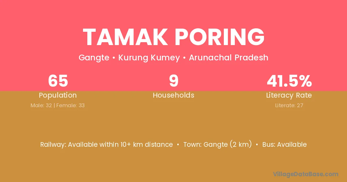 Gangte (2 km) is the nearest town to Tamak Poring village for major economic activities and is located approximately 2 km away.