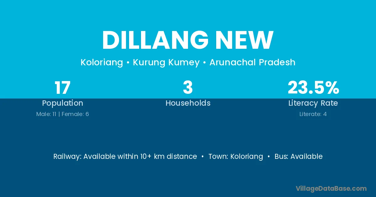 Dillang New village has a total population of 17 people, of which 11 are males and 6 are females.