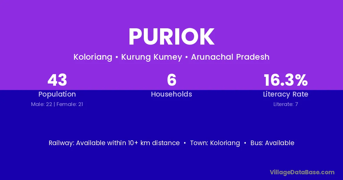 Puriok village has a total population of 43 people, of which 22 are males and 21 are females.