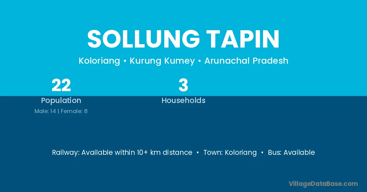 Sollung Tapin village has a total population of 22 people, of which 14 are males and 8 are females.