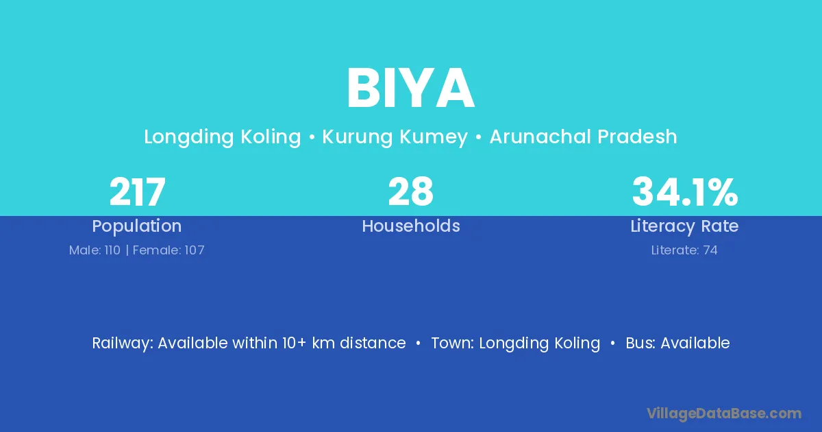 Biya village has a total population of 217 people, of which 110 are males and 107 are females.