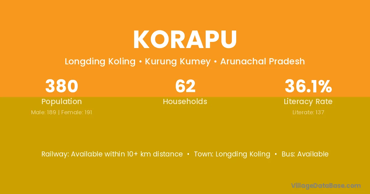 Longding Koling is the nearest town to Korapu village for major economic activities