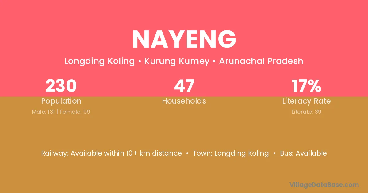 Nayeng village has a total population of 230 people, of which 131 are males and 99 are females.
