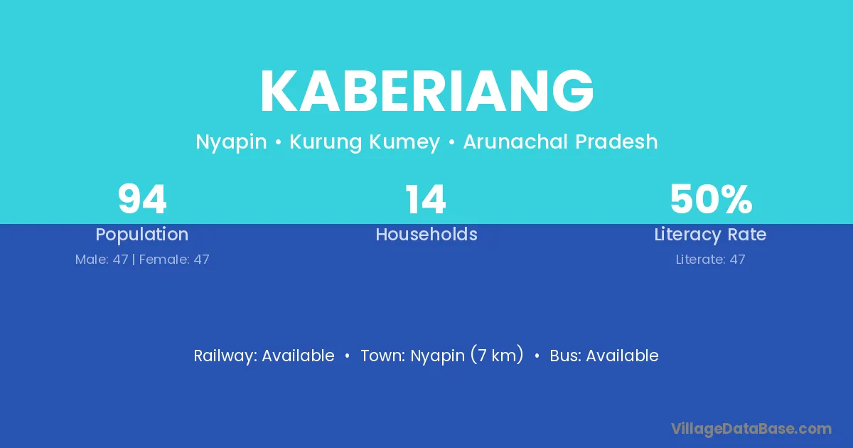 Kaberiang village has a total population of 94 people, of which 47 are males and 47 are females.