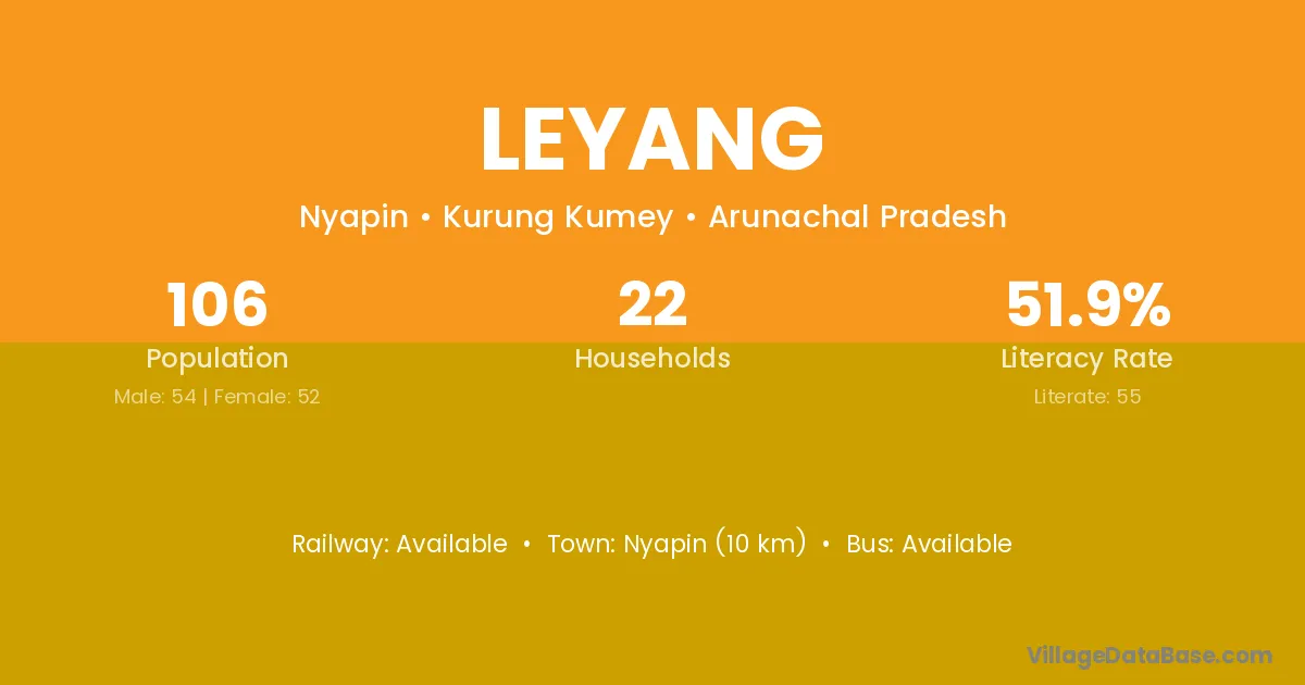 Leyang village has a total population of 106 people, of which 54 are males and 52 are females.