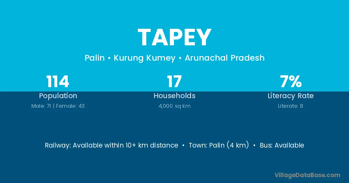 Tapey village has a total population of 114 people, of which 71 are males and 43 are females.