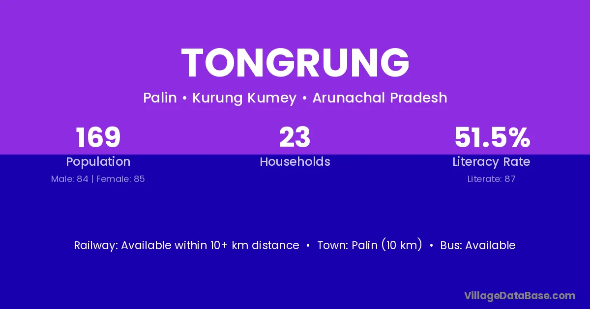 Palin (10 km) is the nearest town to Tongrung village for major economic activities and is located approximately 10 km away.