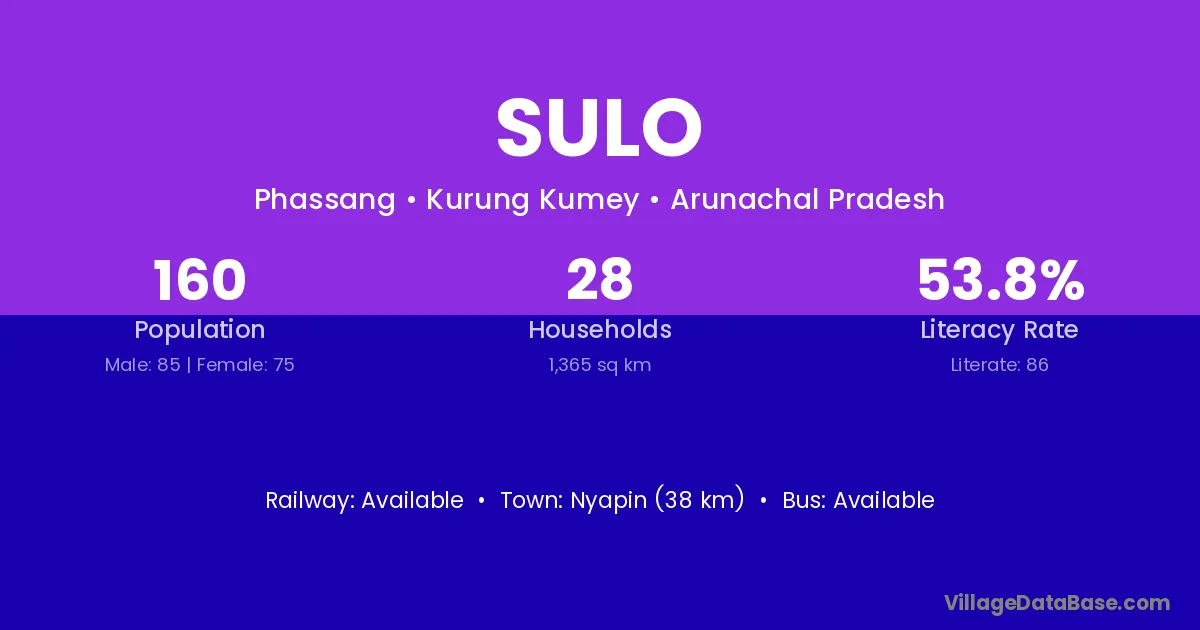 Nyapin (38 km) is the nearest town to Sulo village for major economic activities and is located approximately 38 km away.