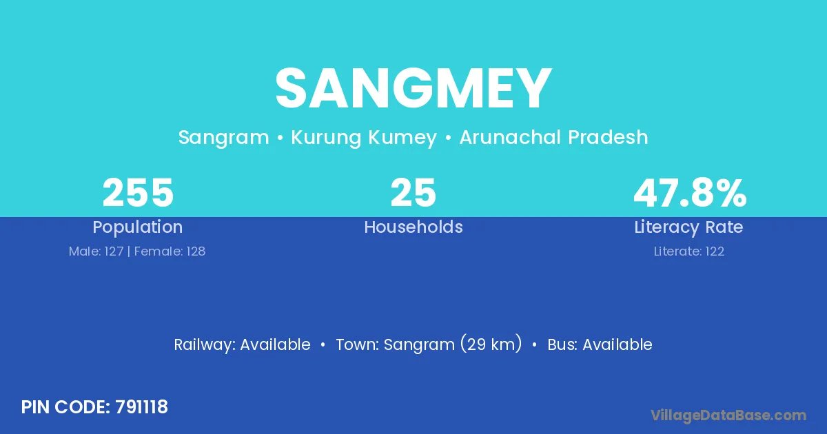 Sangmey village has a total population of 255 people, of which 127 are males and 128 are females.