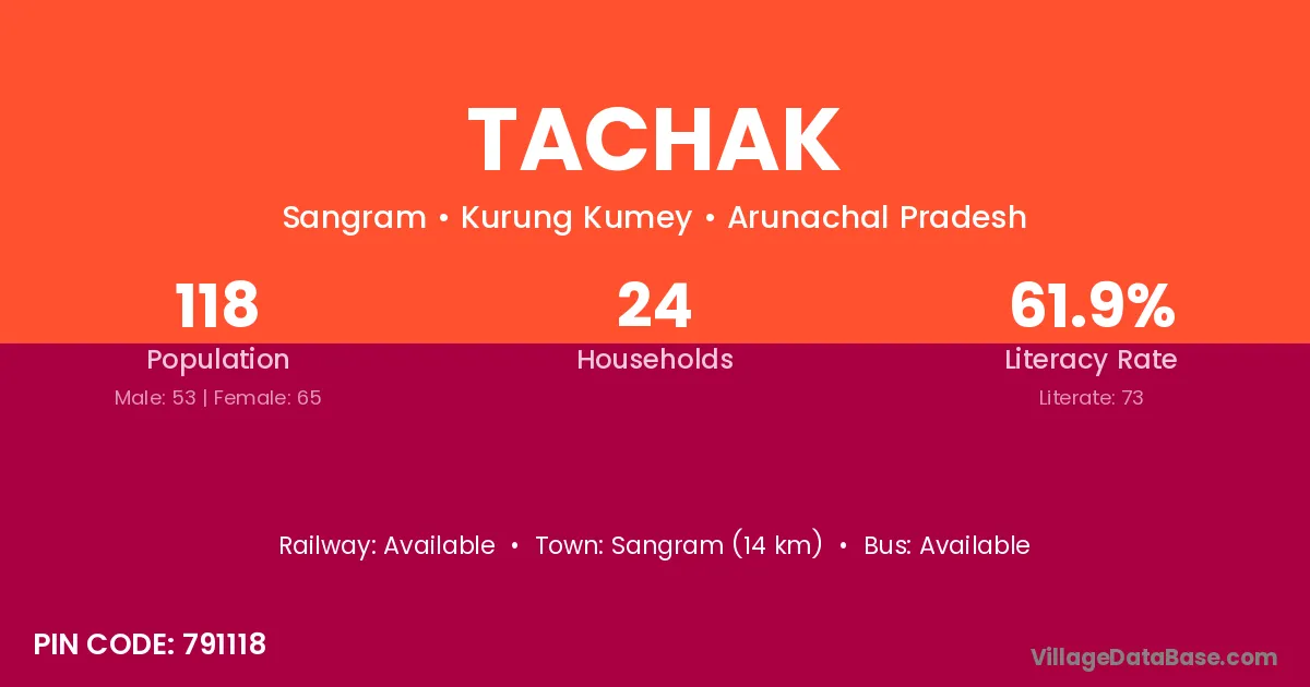 Tachak village has a total population of 118 people, of which 53 are males and 65 are females.