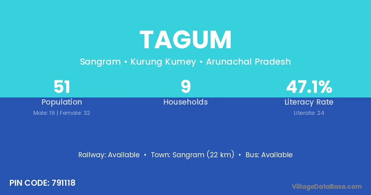 The literacy rate of Tagum village is 47.06%. Male literacy stands at 57.89% and female literacy at 40.63%.