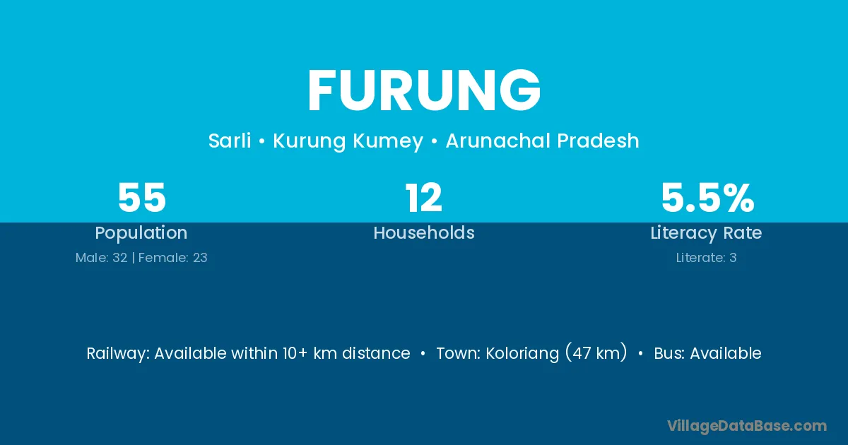 Furung village has a total population of 55 people, of which 32 are males and 23 are females.
