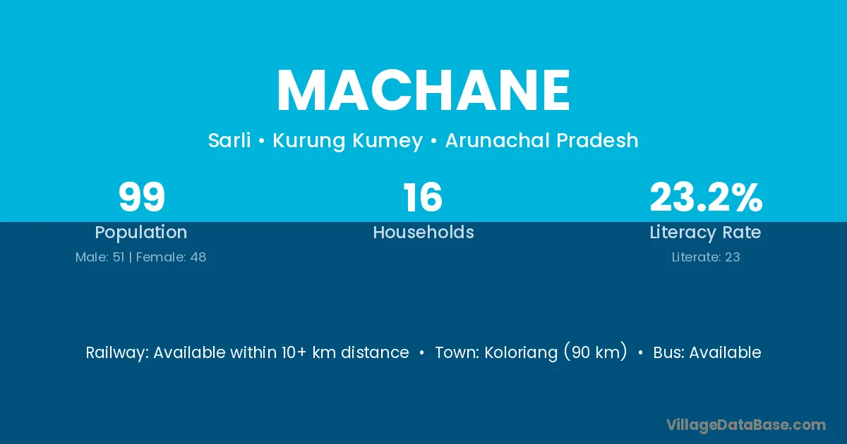 The literacy rate of Machane village is 23.23%. Male literacy stands at 29.41% and female literacy at 16.67%.