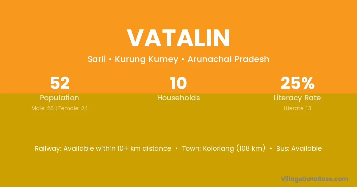 The literacy rate of Vatalin village is 25.00%. Male literacy stands at 32.14% and female literacy at 16.67%.