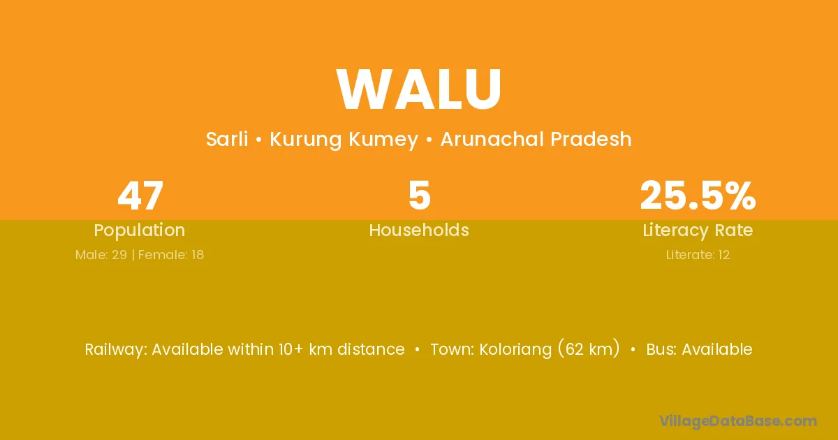 Walu village has a total population of 47 people, of which 29 are males and 18 are females.