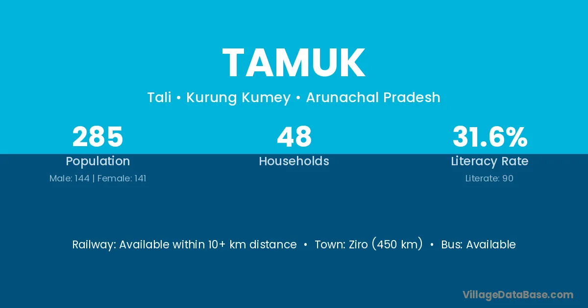 Tamuk village has a total population of 285 people, of which 144 are males and 141 are females.