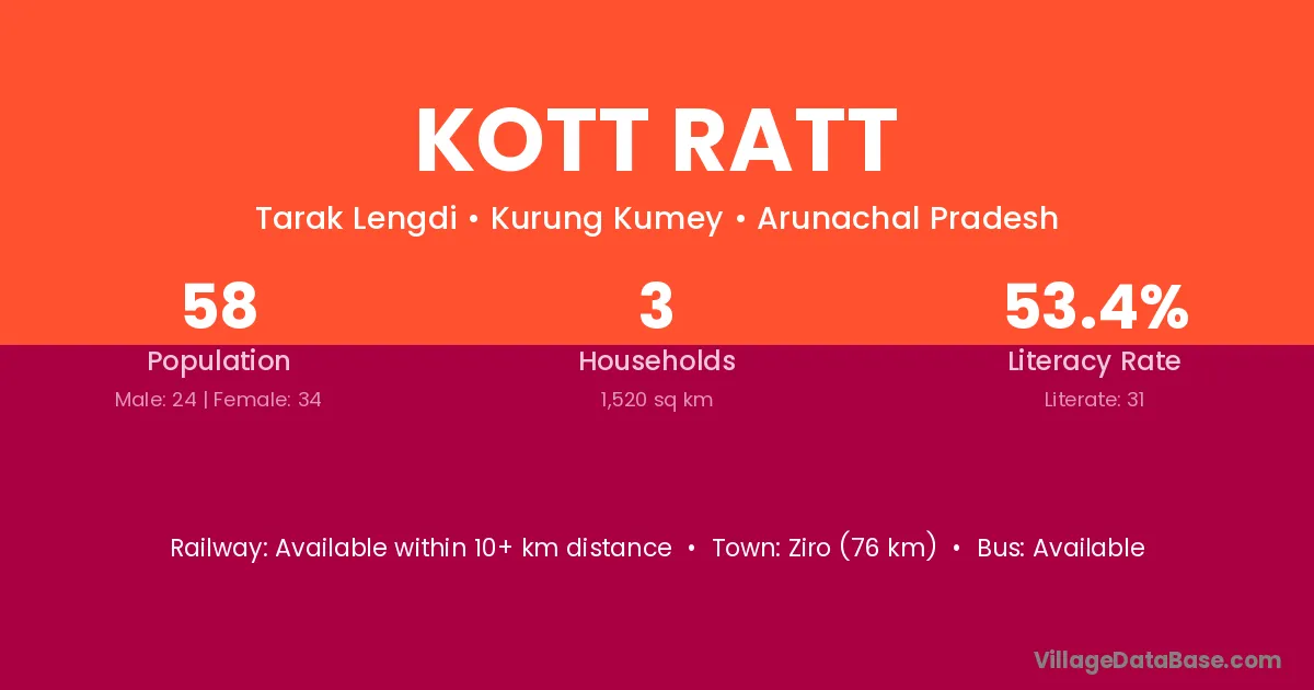 Ziro (76 km) is the nearest town to Kott Ratt village for major economic activities and is located approximately 76 km away.