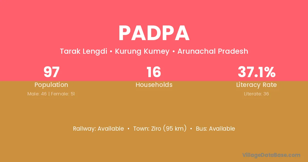 Ziro (95 km) is the nearest town to Padpa village for major economic activities and is located approximately 95 km away.