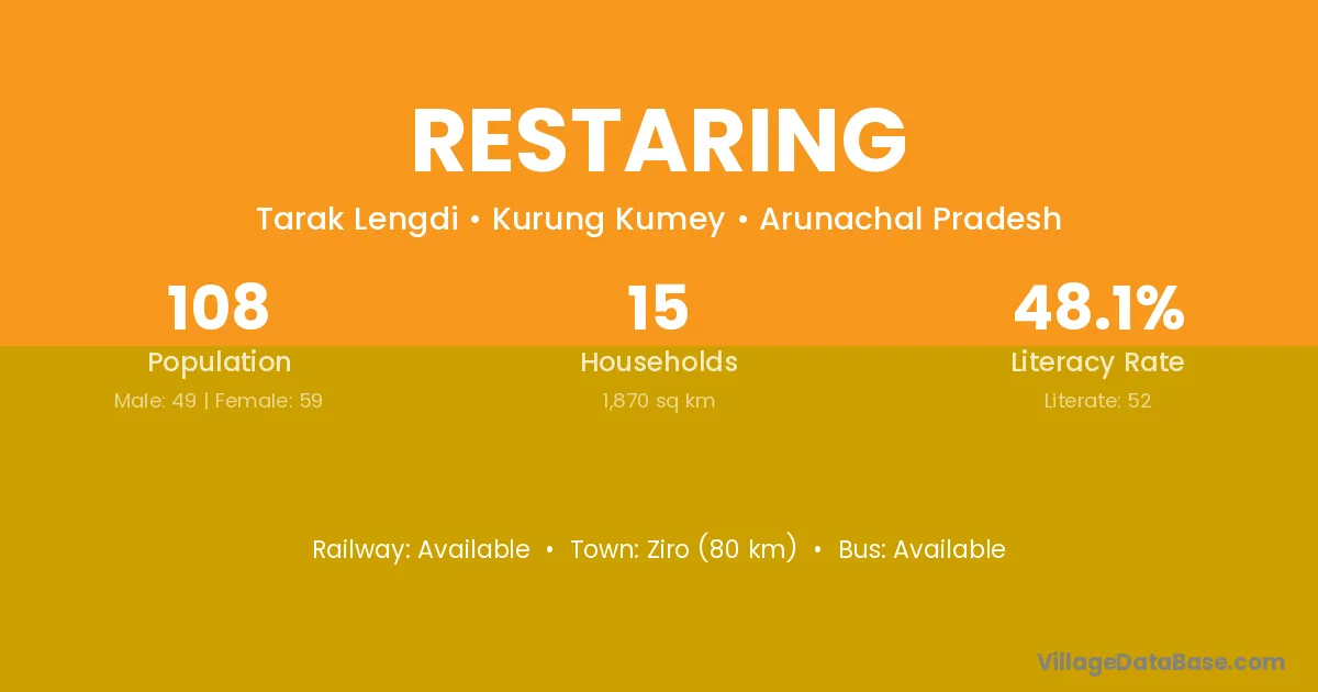 Ziro (80 km) is the nearest town to Restaring village for major economic activities and is located approximately 80 km away.