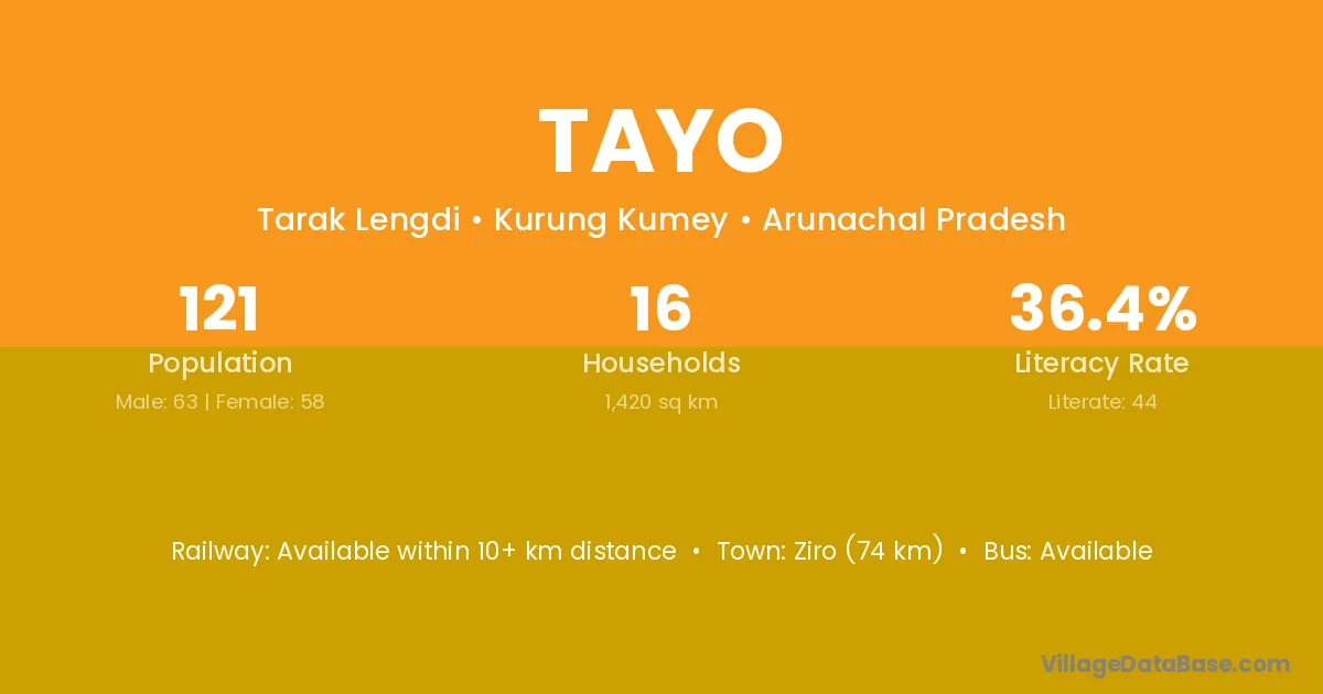 Ziro (74 km) is the nearest town to Tayo village for major economic activities and is located approximately 74 km away.