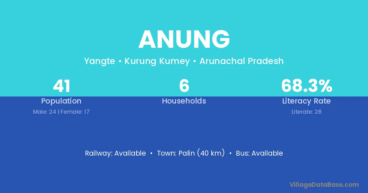Anung village has a total population of 41 people, of which 24 are males and 17 are females.