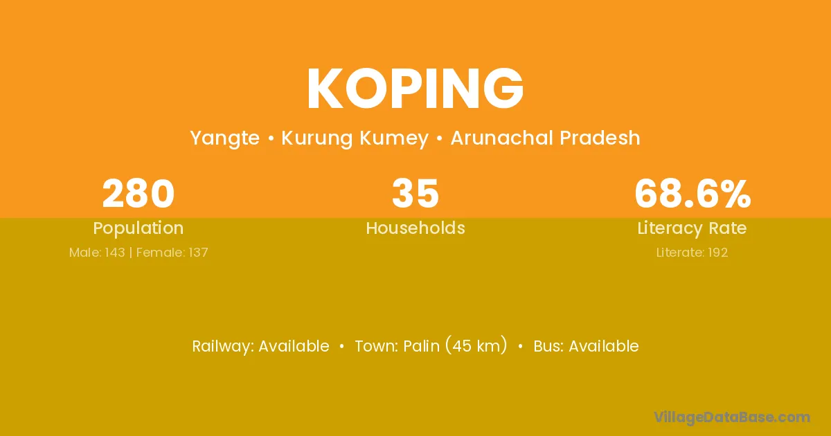 The literacy rate of Koping village is 68.57%. Male literacy stands at 73.43% and female literacy at 63.50%.