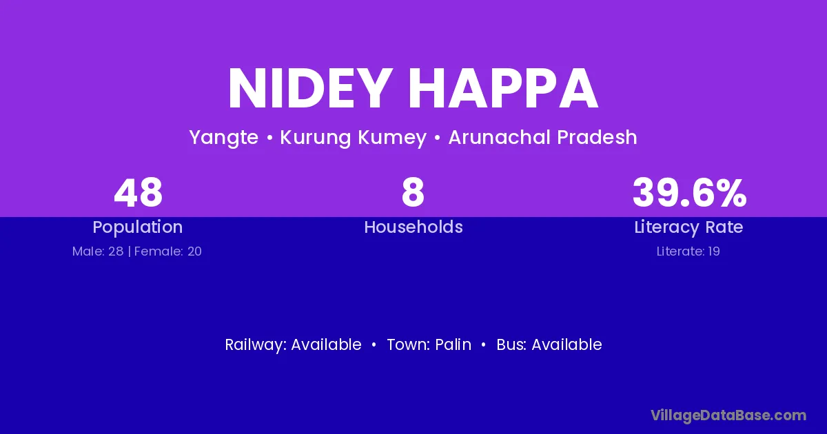 The literacy rate of Nidey Happa village is 39.58%. Male literacy stands at 50.00% and female literacy at 25.00%.