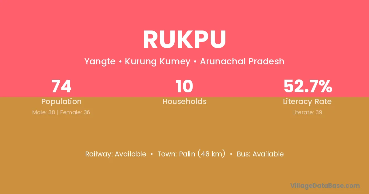 Rukpu village has a total population of 74 people, of which 38 are males and 36 are females.