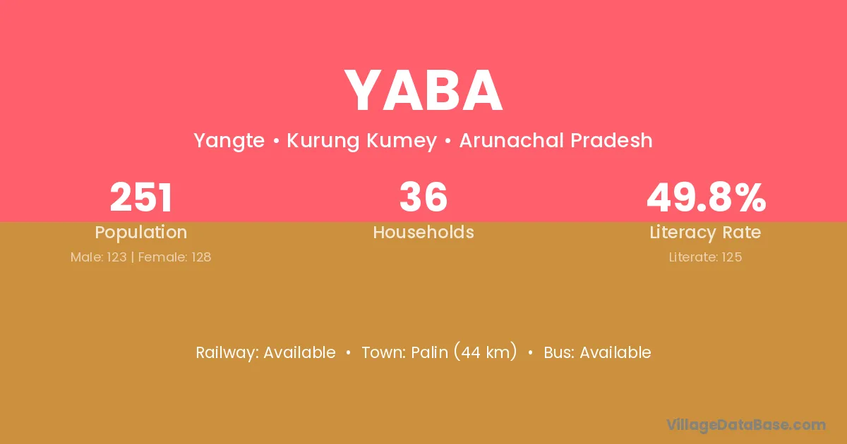 Yaba village has a total population of 251 people, of which 123 are males and 128 are females.