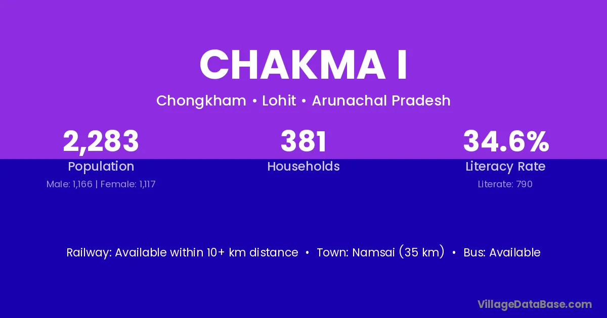 Namsai (35 km) is the nearest town to Chakma I village for major economic activities and is located approximately 35 km away.