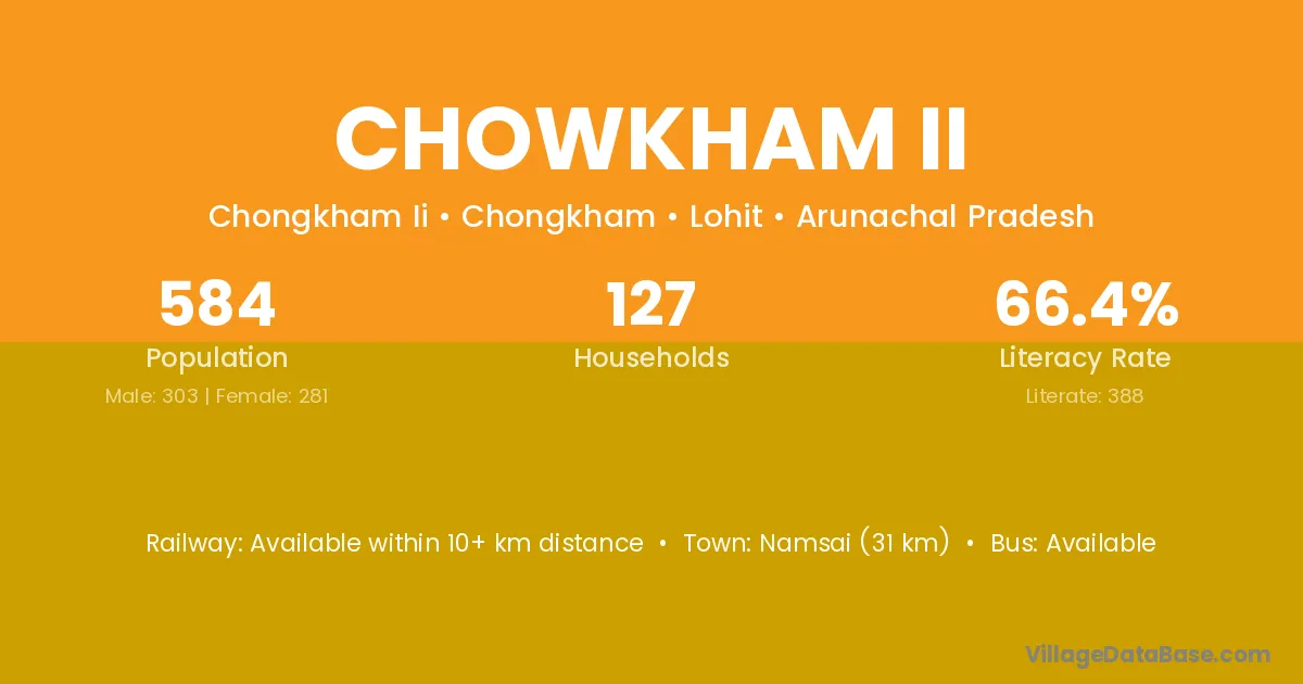 Namsai (31 km) is the nearest town to Chowkham Ii village for major economic activities and is located approximately 31 km away.