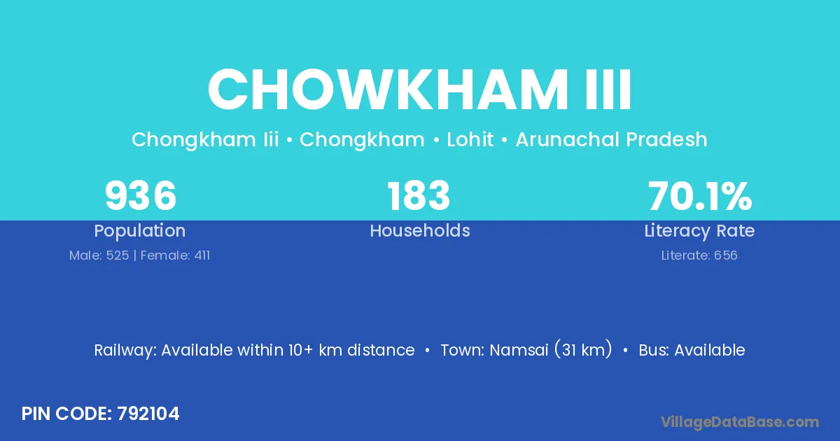 Namsai (31 km) is the nearest town to Chowkham Iii village for major economic activities and is located approximately 31 km away.
