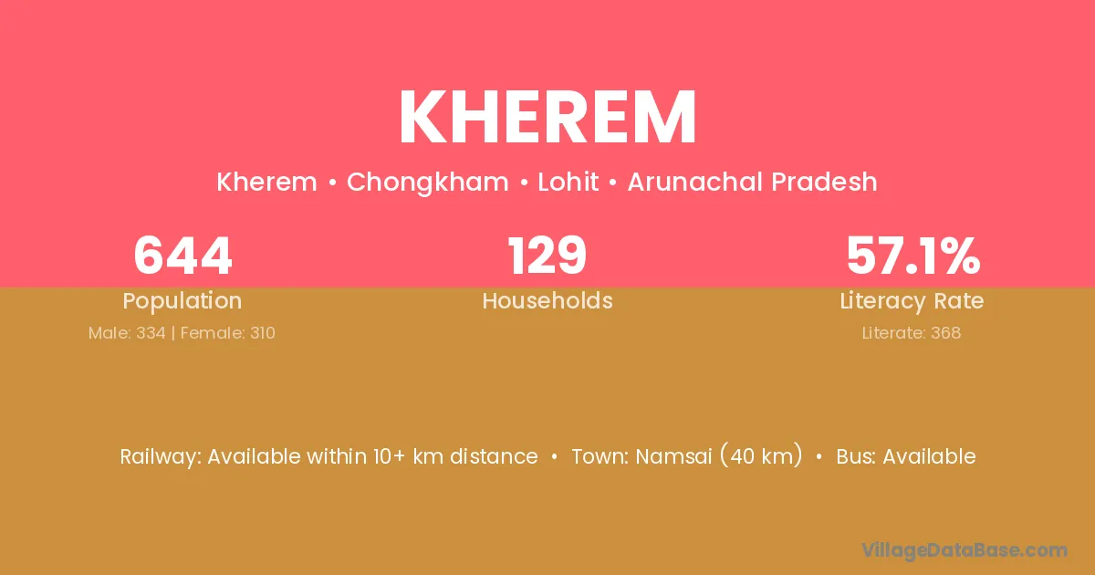 Namsai (40 km) is the nearest town to Kherem village for major economic activities and is located approximately 40 km away.