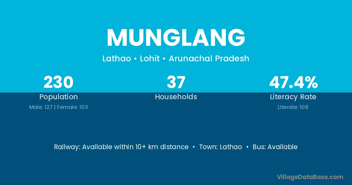 The literacy rate of Munglang village is 58.93%. Male literacy stands at 71.88% and female literacy at 41.67%.