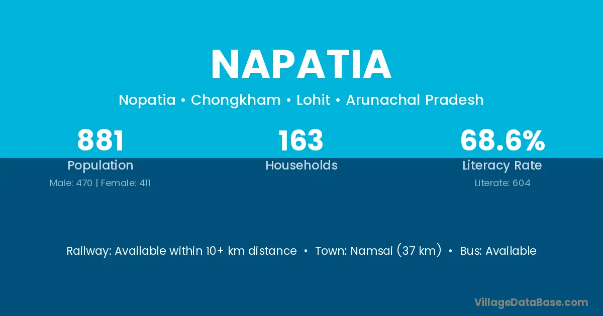 Namsai (37 km) is the nearest town to Napatia village for major economic activities and is located approximately 37 km away.