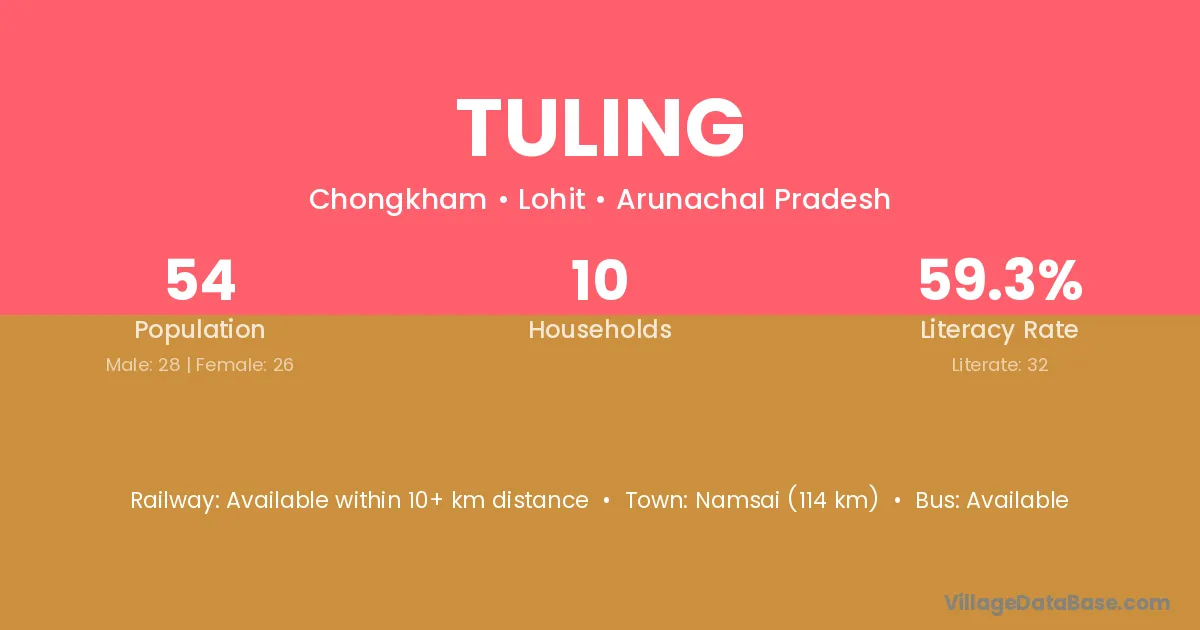The literacy rate of Tuling village is 59.26%. Male literacy stands at 67.86% and female literacy at 50.00%.